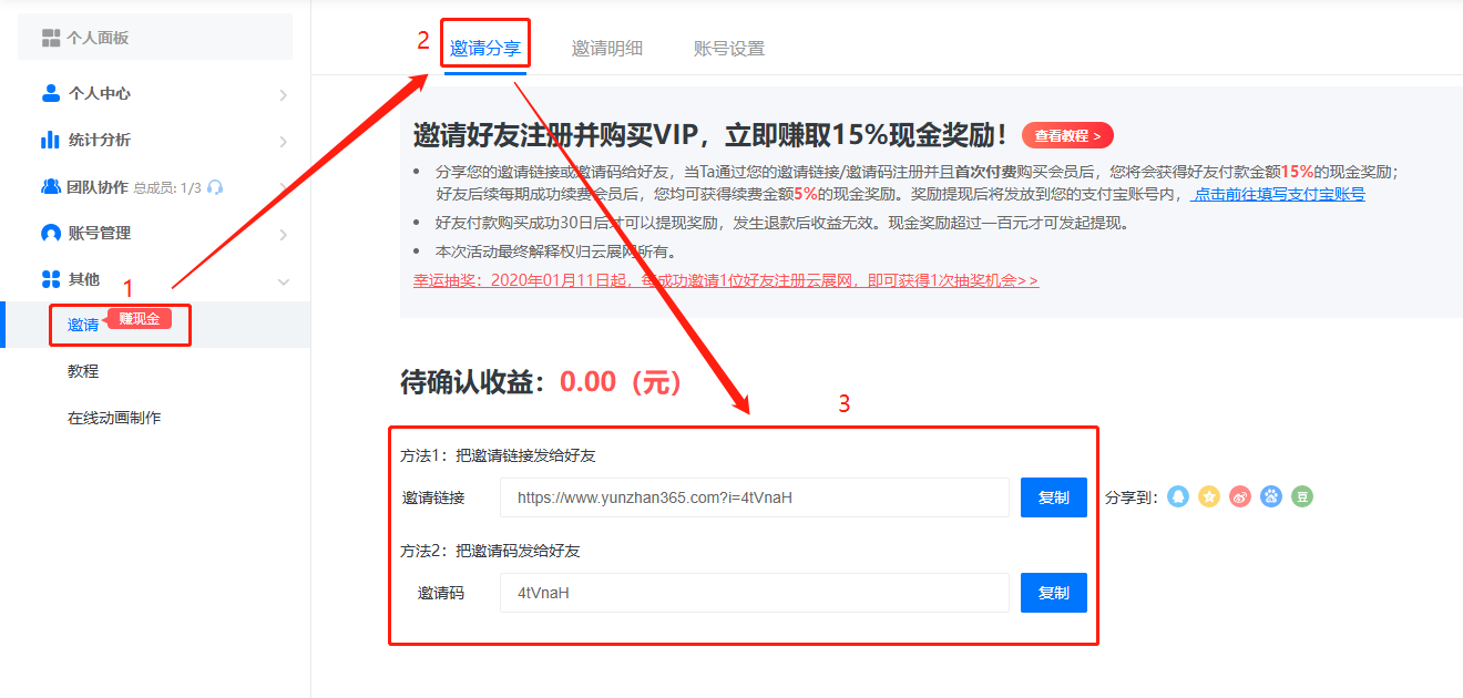 把邀請鏈接或者邀請碼發(fā)給需要購買會員的人注冊云展網(wǎng)賬號,讓他在注冊的時(shí)候務(wù)必填寫您的邀請碼,或者打開您的邀請鏈接注冊。
