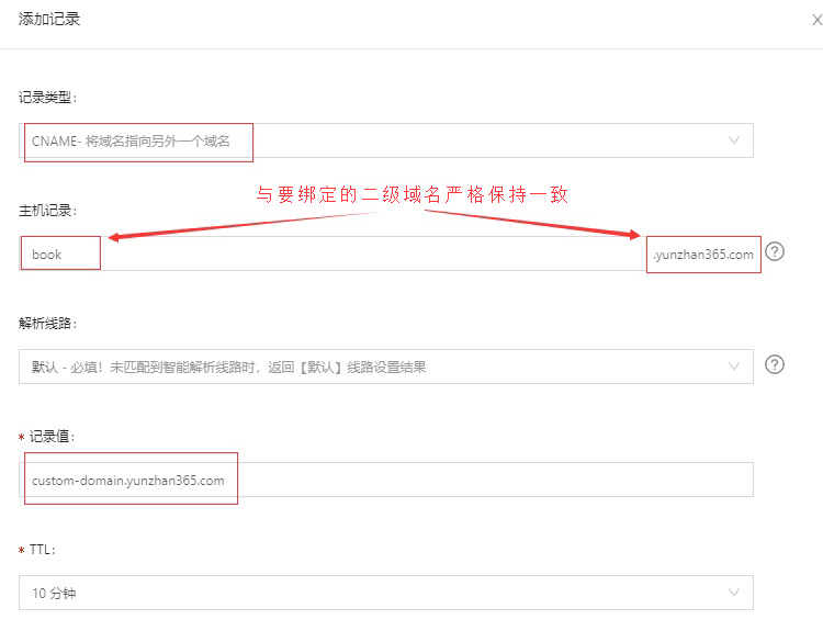 c 選擇CNAME指向另一個域名,在主機記錄填寫您綁定到云展網的二級域名,記錄值填寫:custom-domain.yunzhan365.com