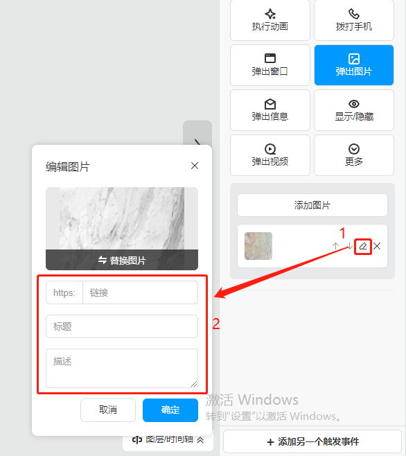 選中需要設(shè)置的文字或者圖片,然后在【觸發(fā)事件】選擇【彈出圖片】點(diǎn)擊添加圖片;如果是選擇圖片設(shè)置彈出大圖,可直接點(diǎn)擊【快速添加本圖】快速添加圖片