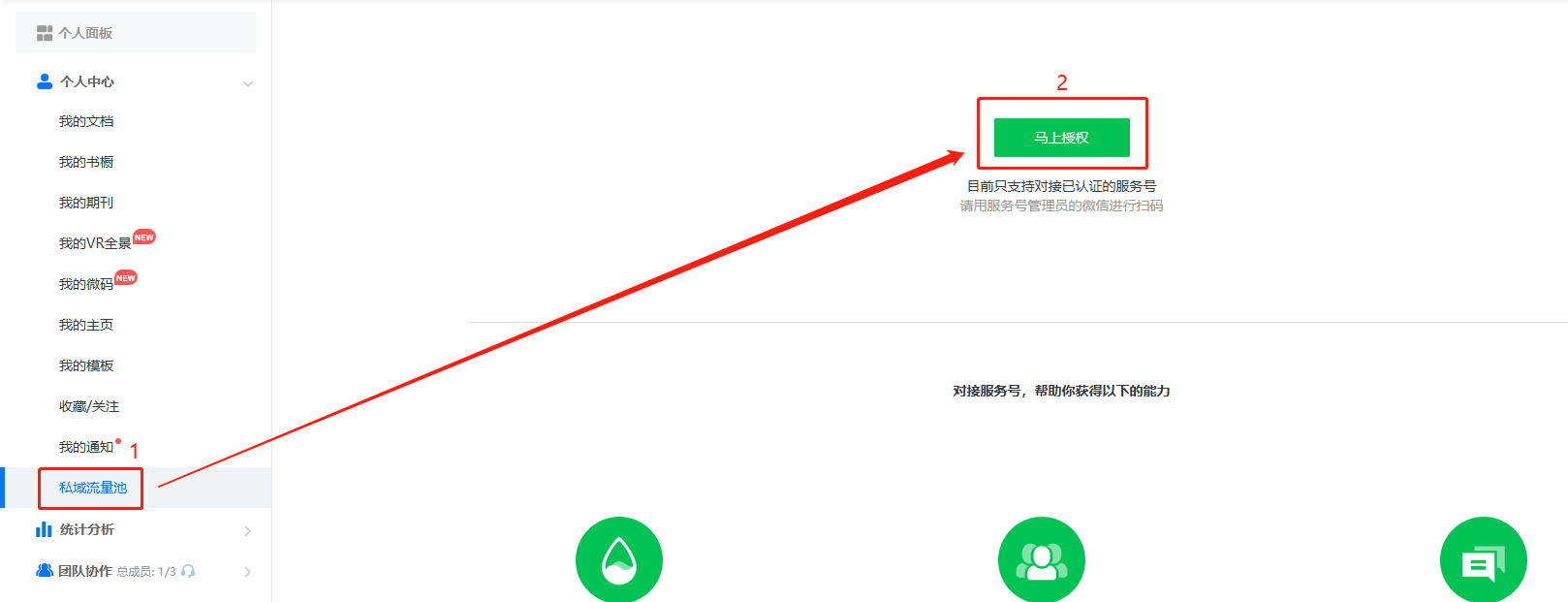 點(diǎn)擊私域流量池,再點(diǎn)擊馬上授權(quán),使用公眾平臺綁定的管理員個(gè)人微信號掃描二維碼進(jìn)行授權(quán)。