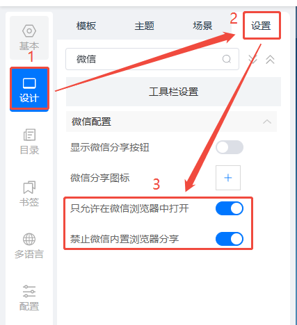 點(diǎn)擊【設(shè)計(jì)】,然后點(diǎn)擊【設(shè)置】,將【只允許在微信瀏覽器中打開(kāi)】和【禁止微信內(nèi)置瀏覽器分享】打都打開(kāi)。