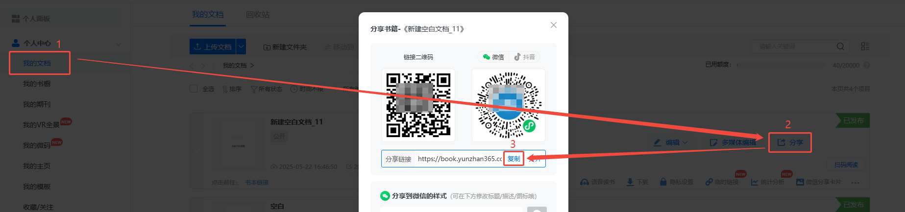 點(diǎn)擊【我的文檔】,然后點(diǎn)擊【分享】,復(fù)制書本鏈接