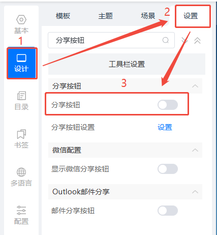 點(diǎn)擊【設(shè)計(jì)】,然后點(diǎn)擊【設(shè)置】,將【分享按鈕】關(guān)閉。