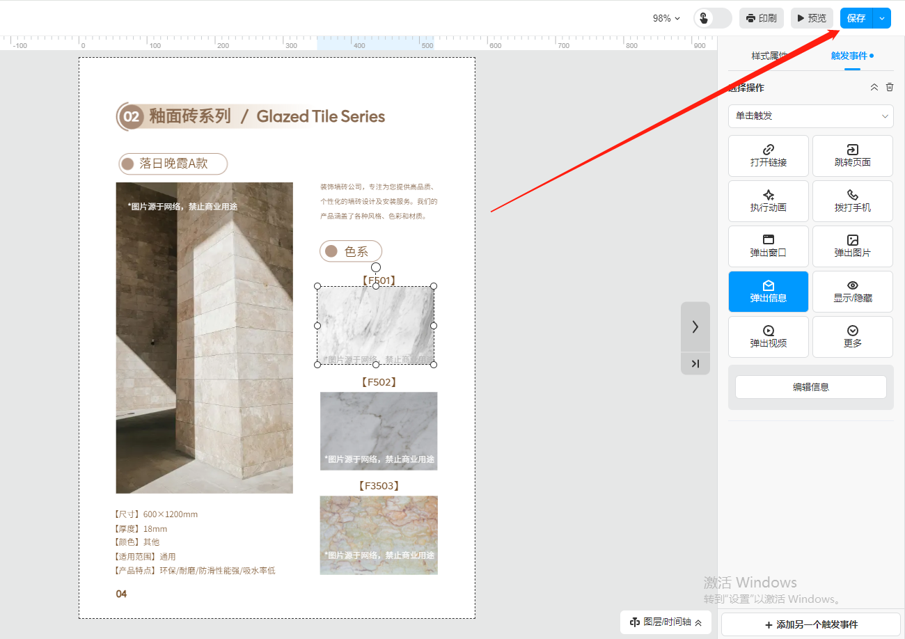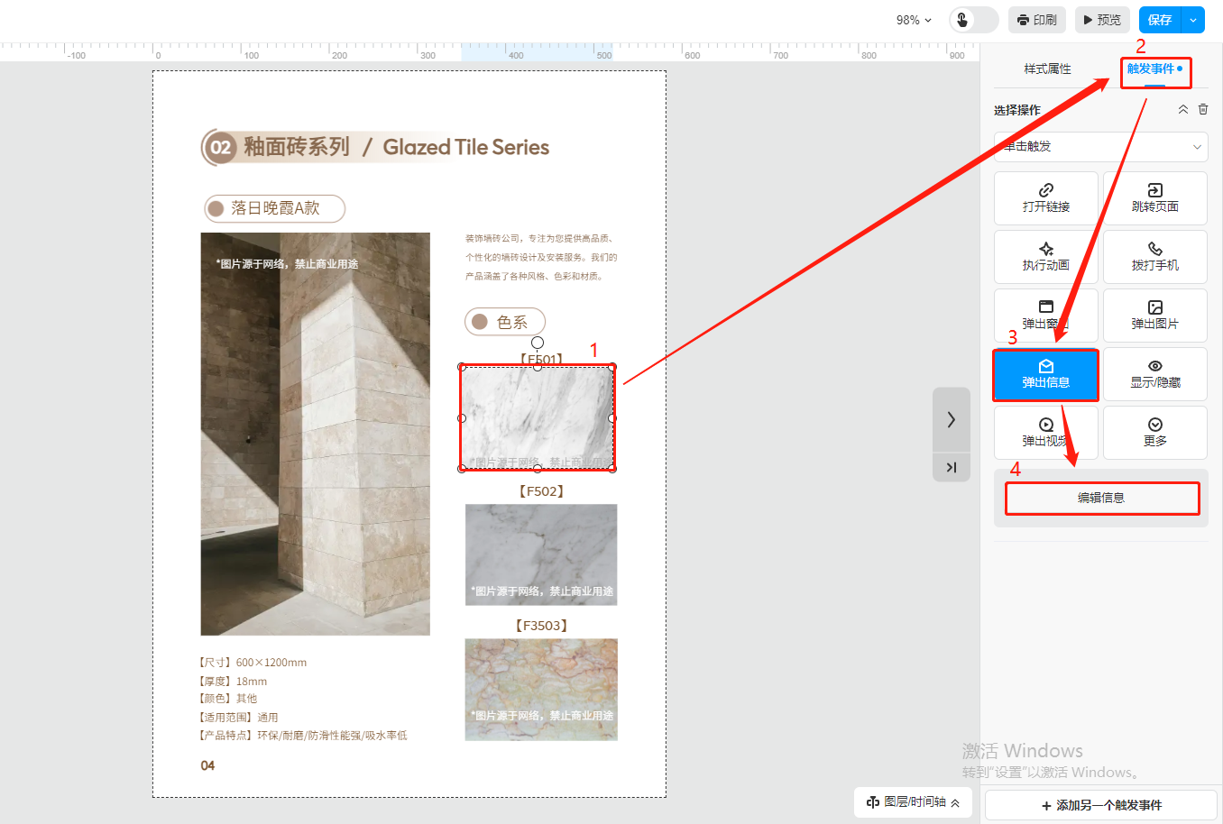 選中需要彈出信息的文字或者圖片,然后在【觸發(fā)事件】選擇【彈出信息】,點(diǎn)擊【編輯信息】。