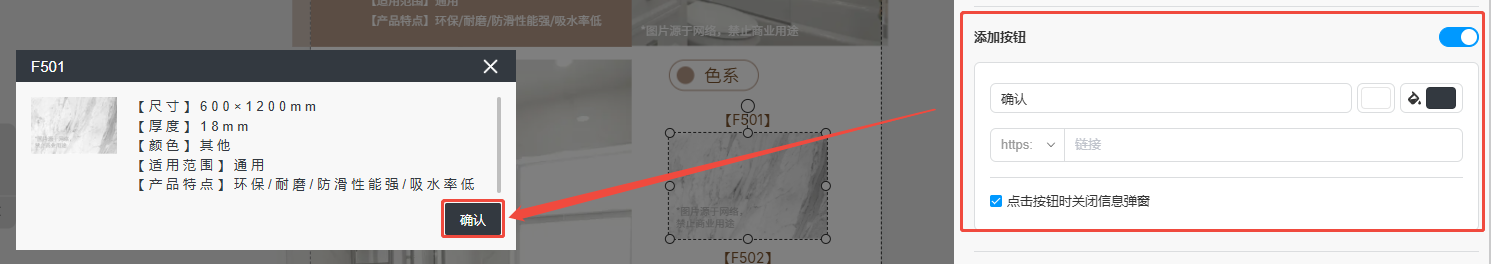右側(cè)打開(kāi)【添加按鈕】,輸入按鈕名稱和點(diǎn)擊按鈕跳轉(zhuǎn)的鏈接,調(diào)整文字樣式,按鈕背景色,勾選【點(diǎn)擊按鈕時(shí)關(guān)閉信息彈窗】。