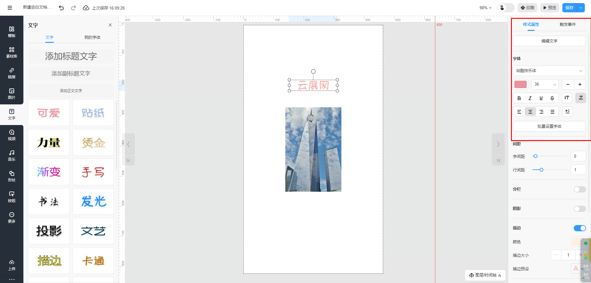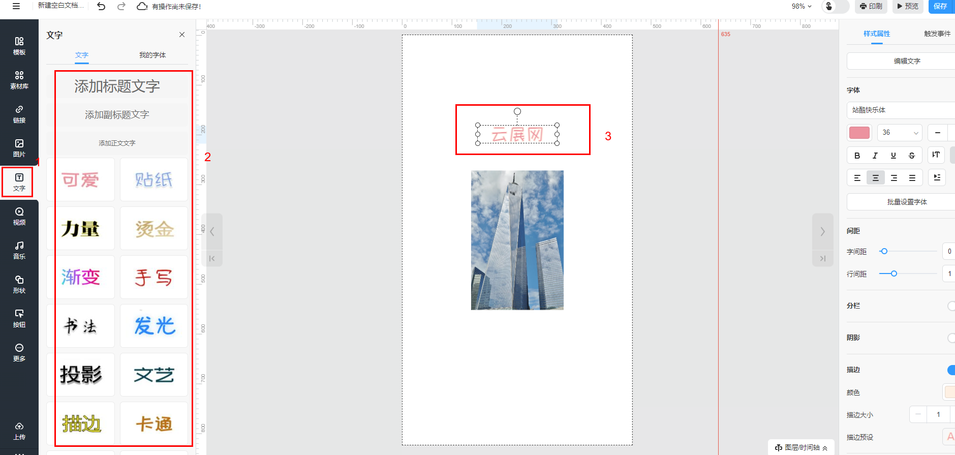選擇【文字】進入文字界面,單擊/拖拽文字類型添至電子書頁面,并雙擊文字框輸入文本內(nèi)容。也可以選擇云展提供的藝術(shù)字進行設(shè)計。