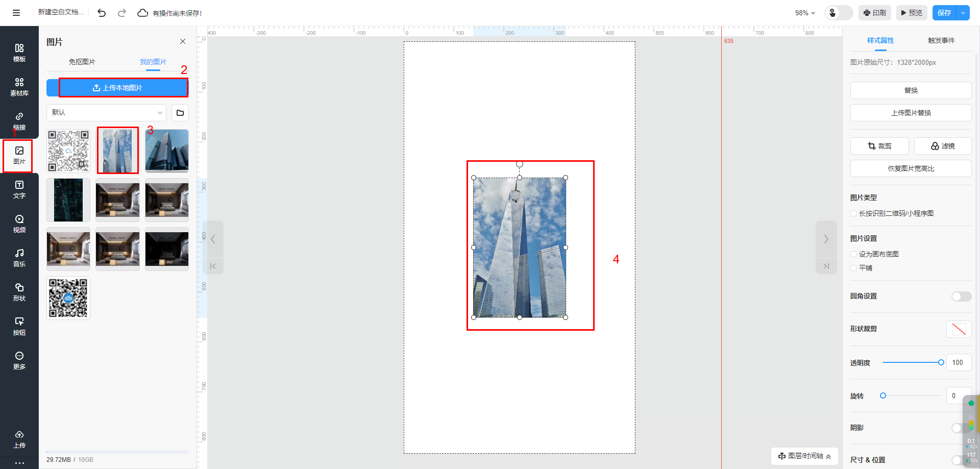 選擇【圖片】進入圖片界面,可以上傳你本地的圖片,上傳圖片后選中圖片添至電子書頁面,通過鼠標(biāo)拖拽調(diào)整圖片的位置大小。