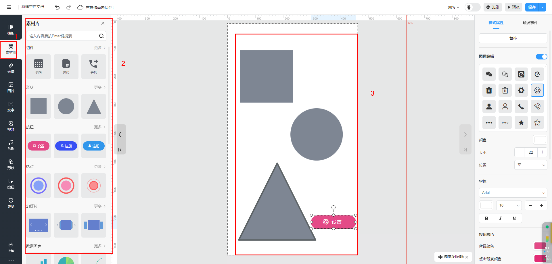 選擇【素材庫】進入素材界面,選擇素材類型,單擊/拖拽素材添至電子書頁面,并可設(shè)置素材顏色、位置、大小等。