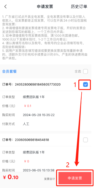 勾選需要申請(qǐng)發(fā)票的訂單,然后點(diǎn)擊【申請(qǐng)發(fā)票】。