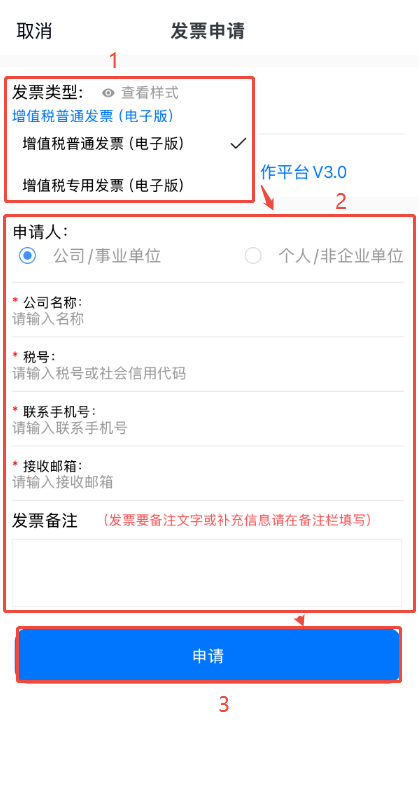 點(diǎn)擊【增值稅普通發(fā)票(電子版)】,選擇發(fā)票類型然后填寫相關(guān)信息,信息要確保無誤,如需在發(fā)票上備注文字,或者普票需要補(bǔ)全地址電話開戶行賬號(hào)的,請(qǐng)?jiān)诎l(fā)票備注欄上填寫,避免影響報(bào)銷,填寫完點(diǎn)擊下方【申請(qǐng)】即可。