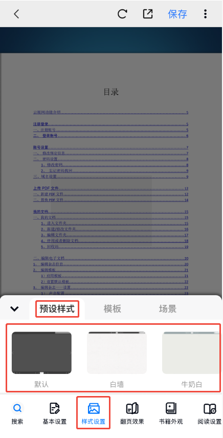 點擊【樣式設(shè)置】,然后點擊【預(yù)設(shè)樣式】,可以看到云展網(wǎng)提供的背景圖,根據(jù)自身喜好選擇即可,左滑可以查看更多背景圖。