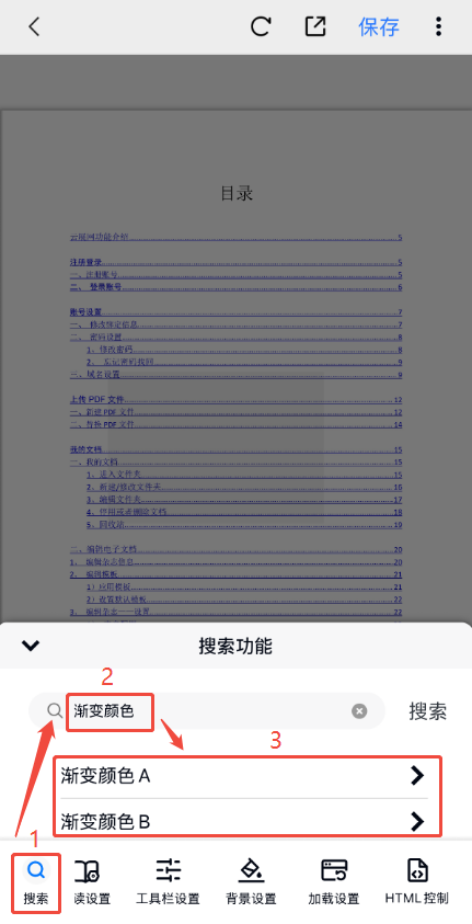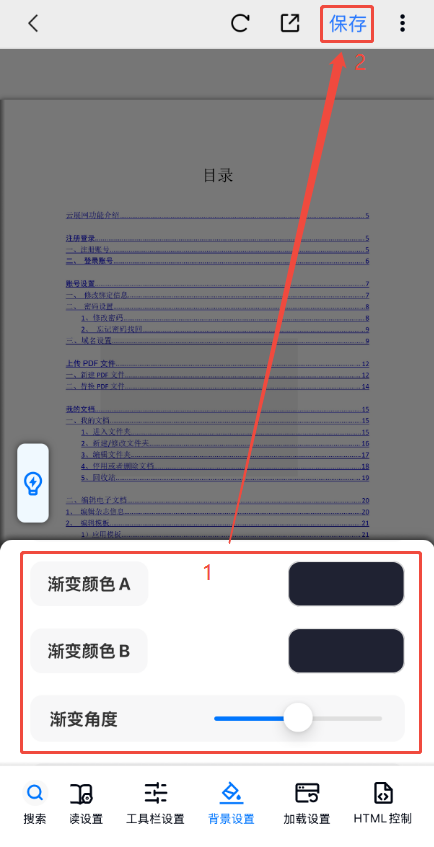 點擊左下角【搜索】,在搜索框輸入【漸變顏色】,然后點擊【漸變顏色A】或者【漸變顏色B】,選擇顏色以及調(diào)整漸變角度后,點擊右上角【保存】即可。