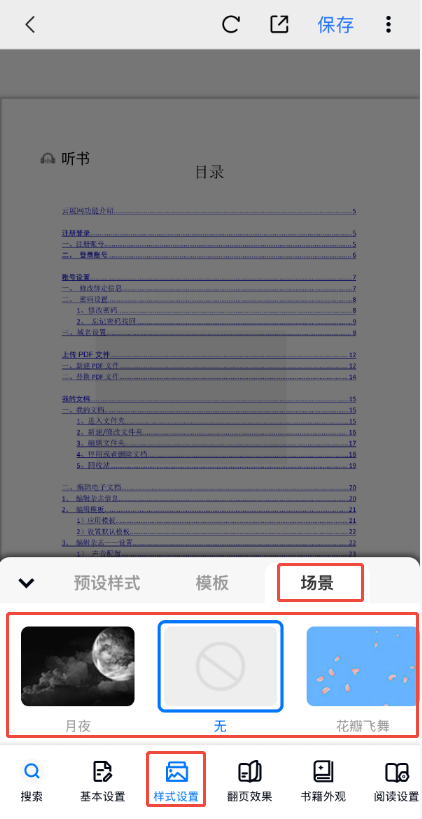 點擊【樣式設(shè)置】,然后點擊【場景】,可以看到云展網(wǎng)提供的動態(tài)背景,根據(jù)自身喜好選擇即可,左滑可以查看更多場景。