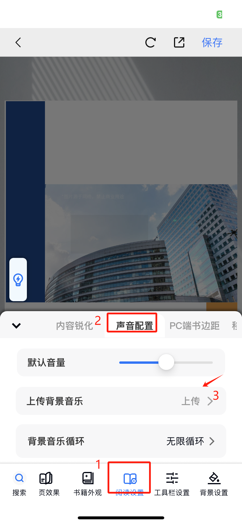 在【閱讀設(shè)置】,點(diǎn)擊【聲音配置】,點(diǎn)擊【上傳背景音樂】上傳mp3格式的音樂文件