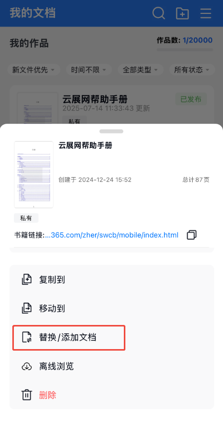 點(diǎn)擊【作品】,點(diǎn)擊對(duì)應(yīng)電子書(shū)右邊的三個(gè)點(diǎn),然后點(diǎn)擊【替換/添加文檔】,打開(kāi)替換文檔界面。