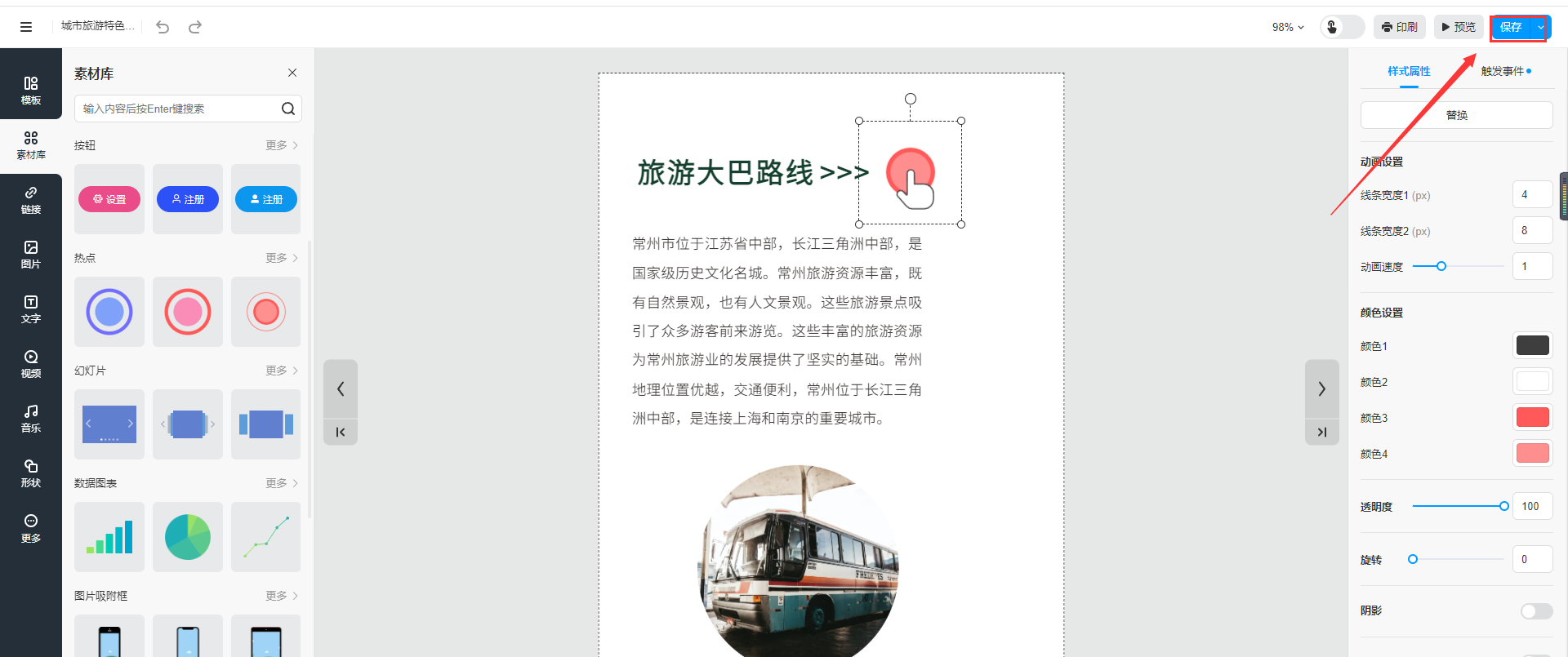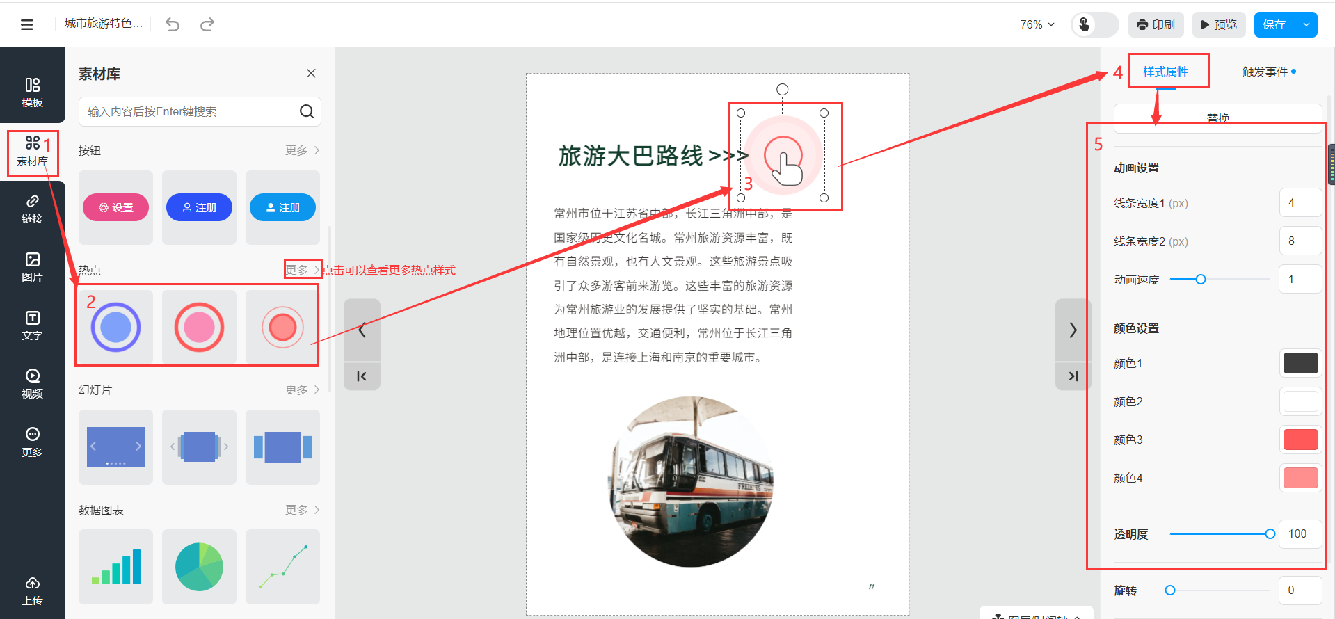 點(diǎn)擊【素材庫】,選擇【熱點(diǎn)】添加在頁面合適的位置上,右側(cè)點(diǎn)擊【樣式屬性】可更改熱點(diǎn)樣式