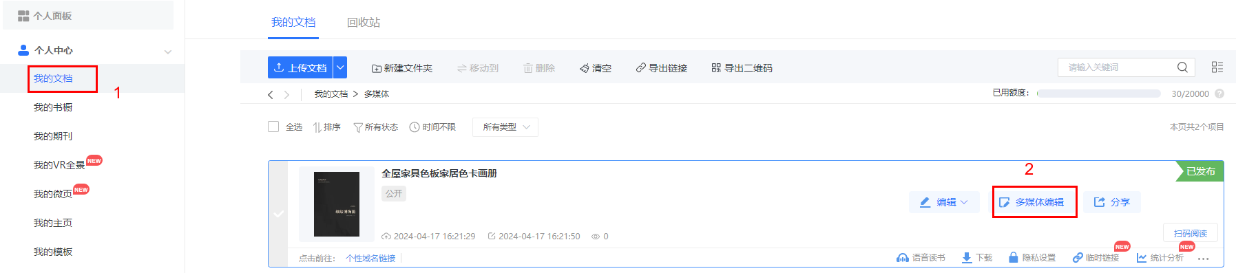 (1)在【我的文檔】/【文檔】中找到需要應(yīng)用模板的書,點(diǎn)擊【多媒體編輯】/【內(nèi)容編輯】
