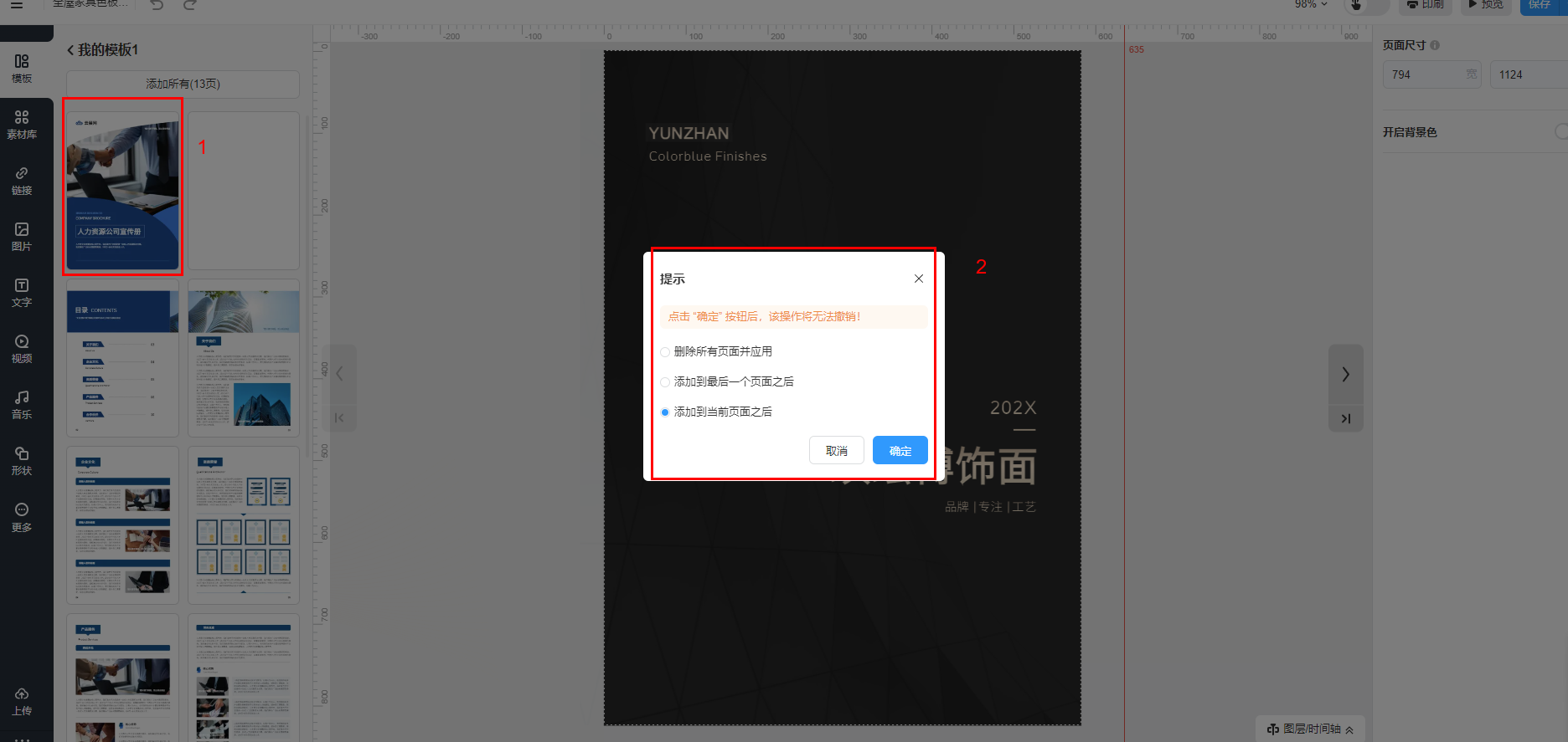 注意:1.應(yīng)用模板的操作無法撤銷,要確定無誤后再操作。
