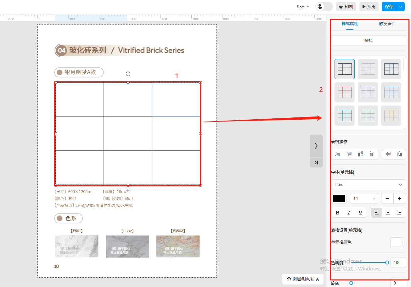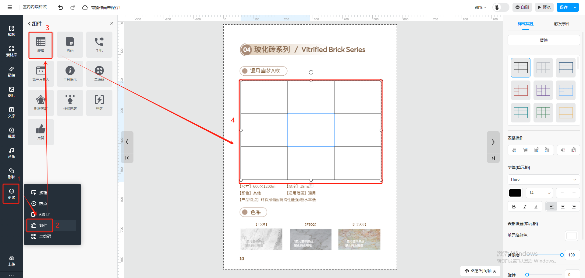 點(diǎn)擊【更多】,選擇【組件】,然后點(diǎn)擊【表格】,就會在頁面上出現(xiàn)一個表格。