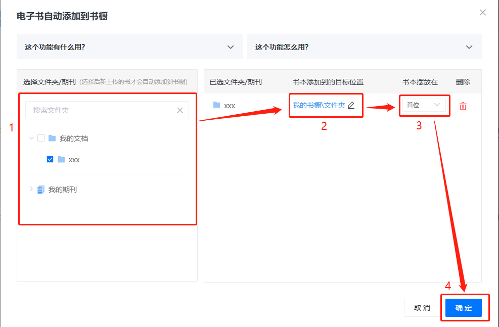 (2)左側(cè)選擇文件夾/期刊,右側(cè)選擇書(shū)本添加到的目標(biāo)位置和擺放位置,后續(xù)在所選文件夾/期刊內(nèi)新上傳的書(shū),將會(huì)自動(dòng)添加到該書(shū)櫥內(nèi)。