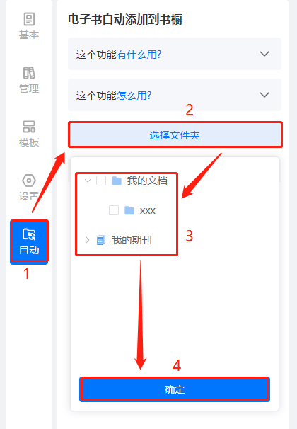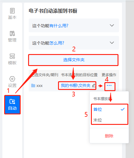 (2)先點(diǎn)擊【自動(dòng)】,再點(diǎn)擊【選擇文件夾】,勾選文件夾/期刊,選擇書(shū)本需要添加到的目標(biāo)位置和擺放位置,后續(xù)在所選文件夾/期刊內(nèi)新上傳的書(shū),將會(huì)自動(dòng)添加到該書(shū)櫥內(nèi)。