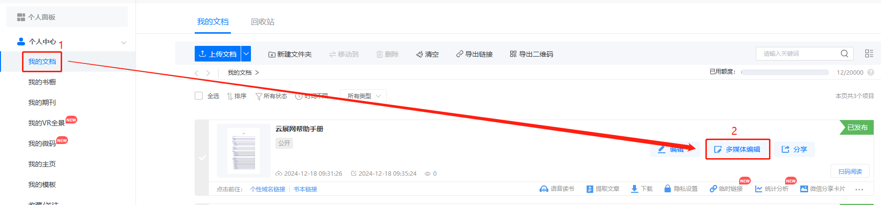 點進【我的文檔】/【文檔】,選擇對應(yīng)電子書,點擊【多媒體編輯】/【內(nèi)容編輯】。