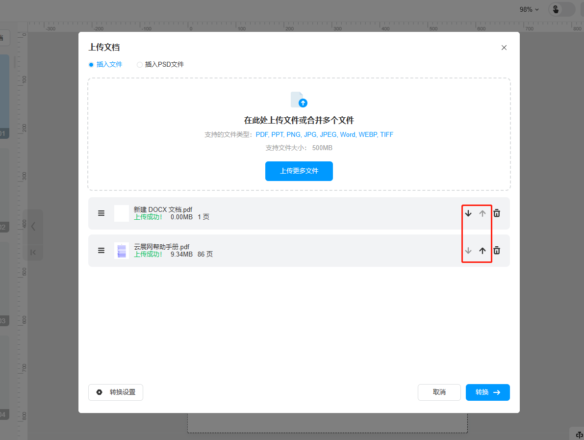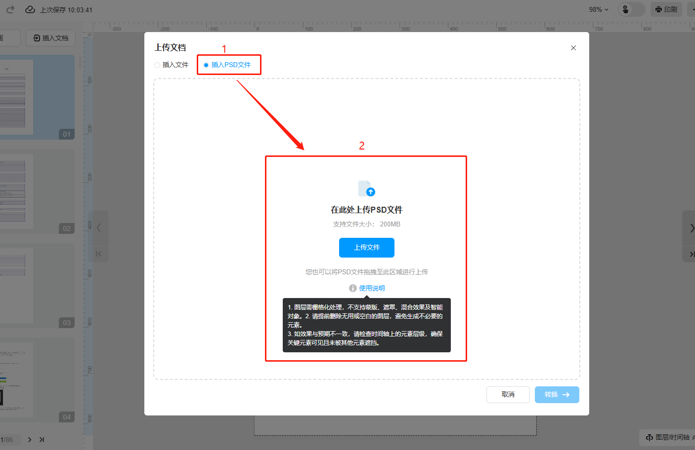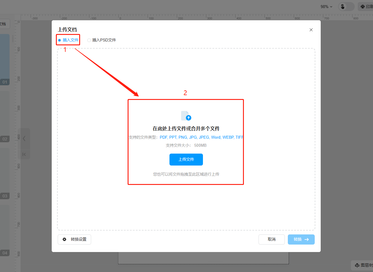b)選擇【插入PSD文件】,點擊【上傳文件】,上傳PSD文件。