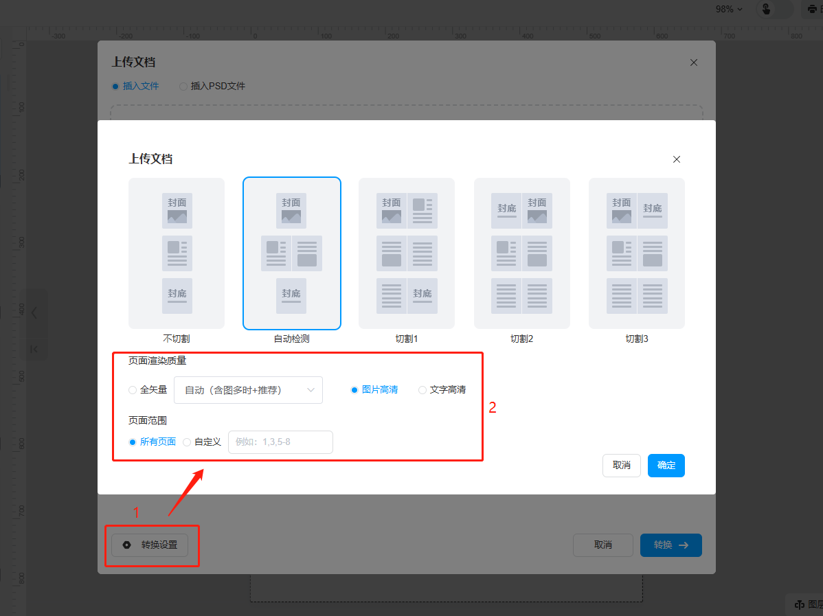 b)點擊【轉(zhuǎn)換設(shè)置】,根據(jù)你的需要,勾選頁面分割模式以及頁面渲染質(zhì)量,設(shè)置頁面范圍,點擊【確認】。如果你上傳的文檔是雙頁的,可以在上傳之前選擇切割方式后再上傳文檔,在上傳界面點擊轉(zhuǎn)換設(shè)置,會彈出四種切割方式,根據(jù)你的文檔排版風(fēng)格來選擇用哪種切割方式。