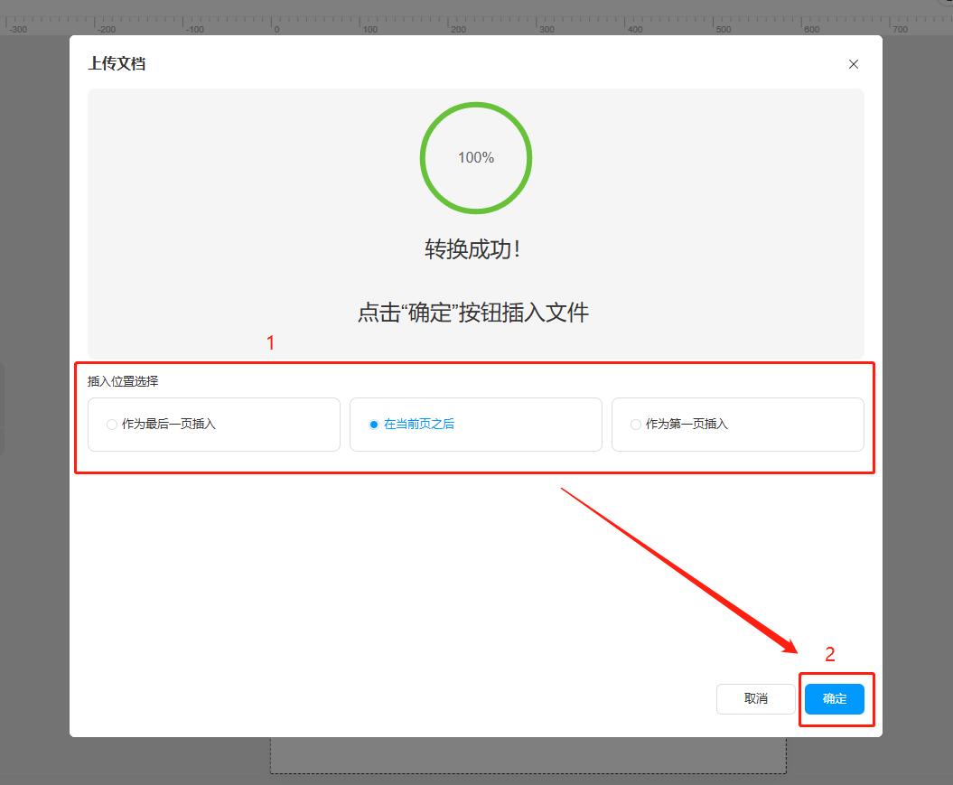c)轉(zhuǎn)換成功后,選擇文檔插入位置,并點擊【確認】完成。