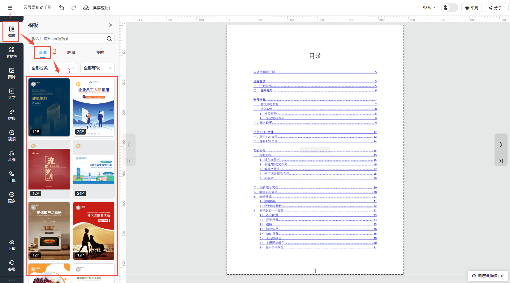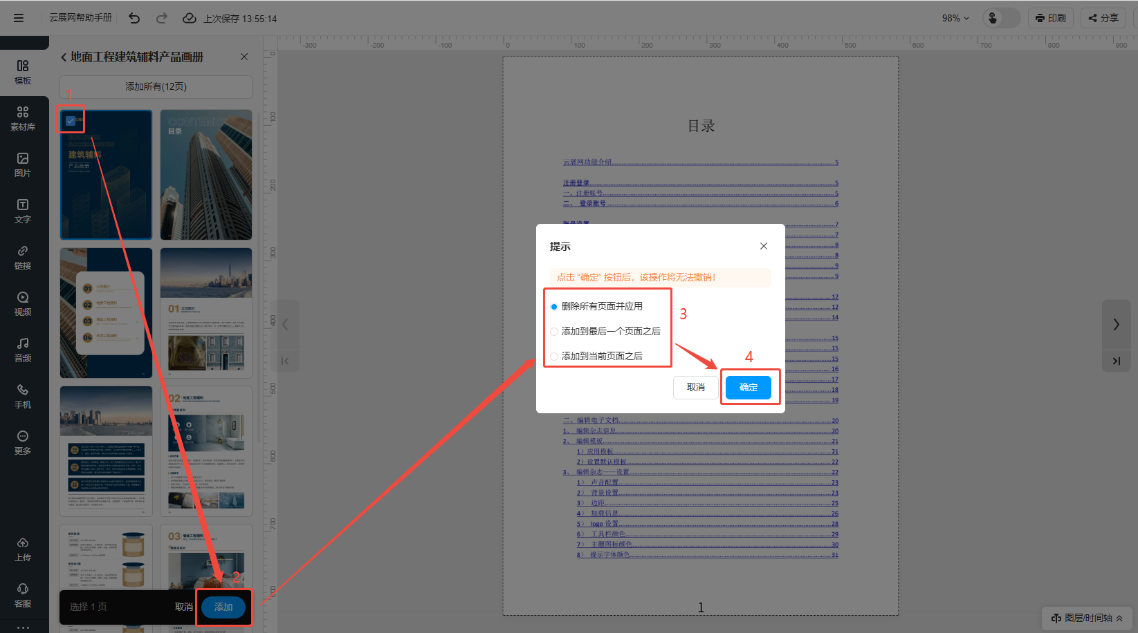 如果你的產(chǎn)品手冊/畫冊需要增加頁面,可以在多媒體編輯這里通過插入文檔的方式來操作,或者是覺得模板頁數(shù)少,也可以通過使用其他模板的頁面來增加頁數(shù)。