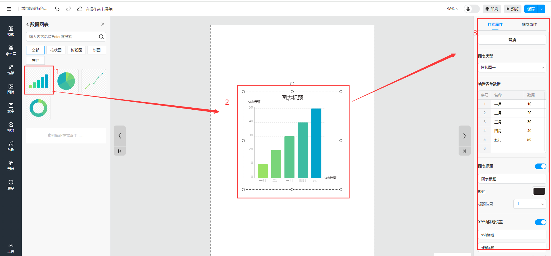 帶數(shù)據(jù)的柱狀圖、餅圖、折線圖等圖表。