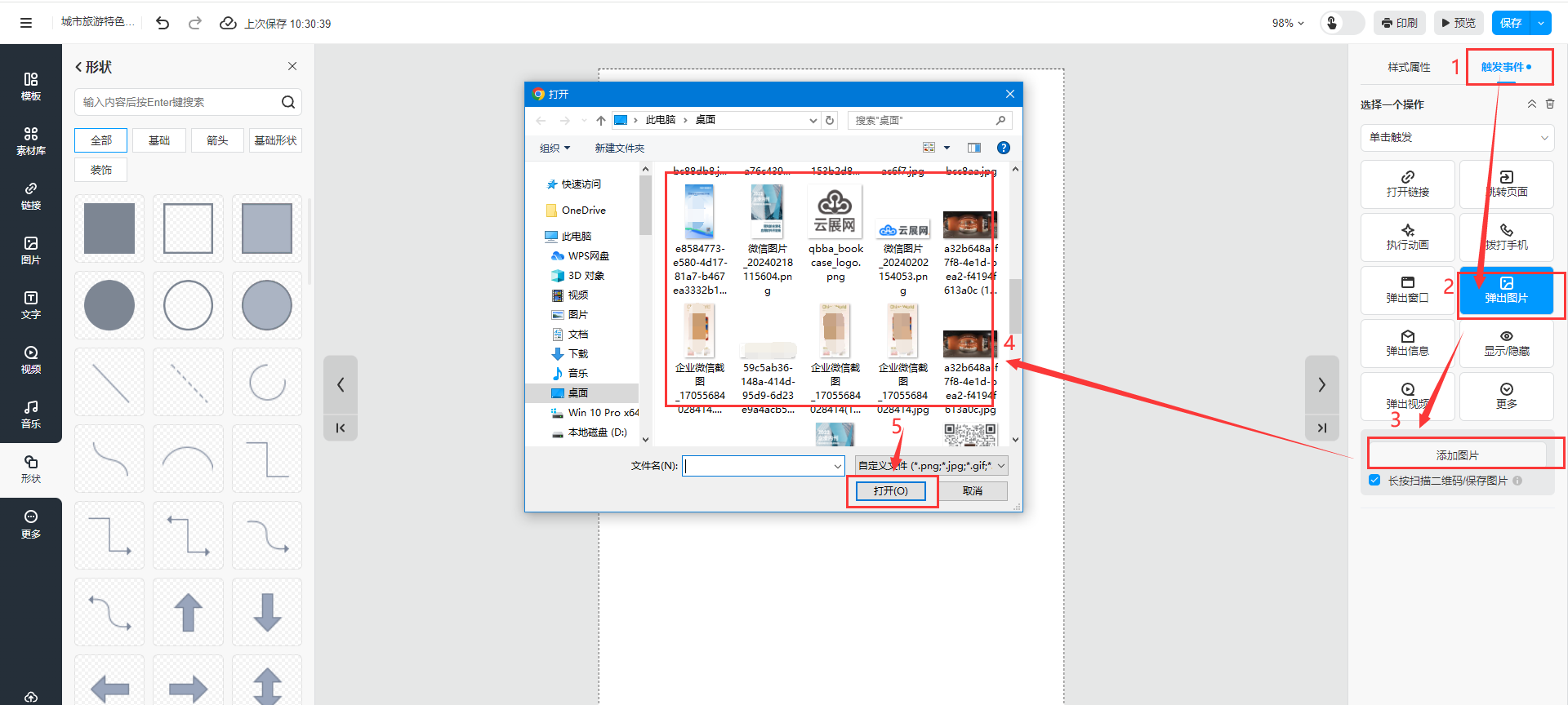 根據(jù)你的需要,你還可以在所選中元素上添加觸發(fā)事件。以【彈出圖片】為例來了解操作如何為元素添加觸發(fā)事件。比如,當(dāng)用戶點擊電子書的某個位置時,彈出圖片。
