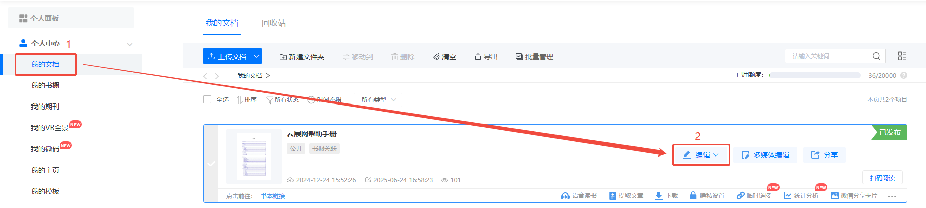 點擊【我的文檔】/【文檔】,然后點擊對應電子書的【編輯】/【外觀設置】,進入編輯器界面。