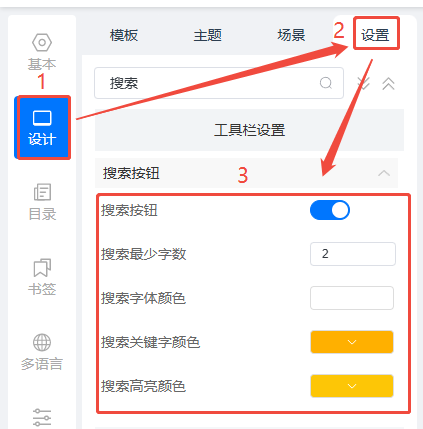 點擊【設計】,然后點擊【設置】,打開【搜索按鈕】即可。