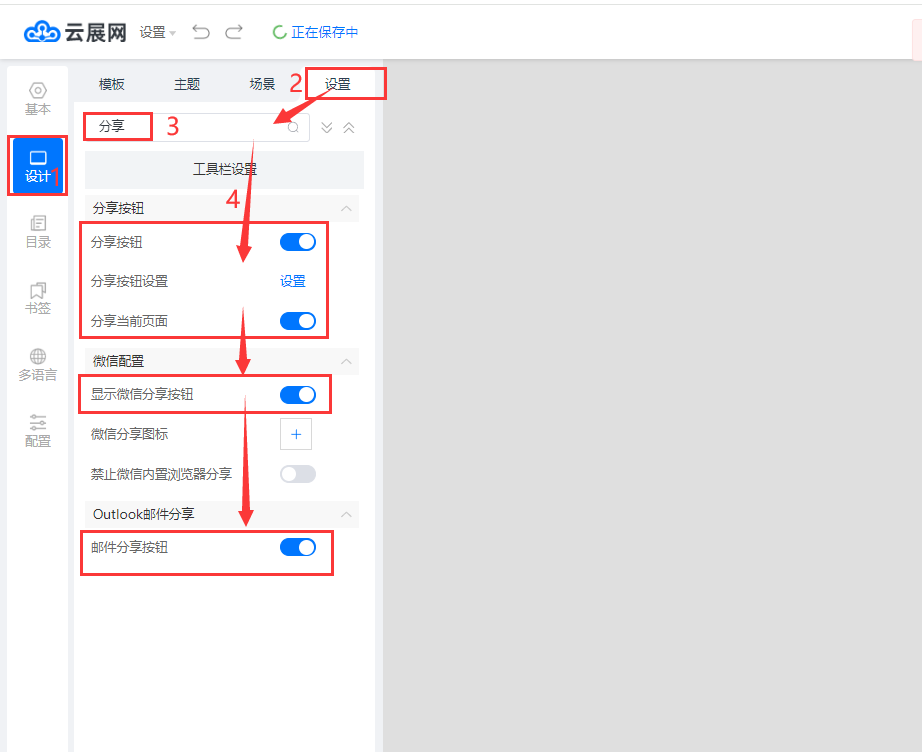 在【設(shè)計(jì)】頁面,點(diǎn)擊【設(shè)置】,輸入“分享關(guān)鍵字”搜索,勾選顯示【分享按鈕】