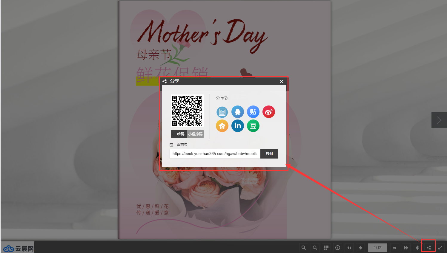 顯示分享按鈕,就會在書本的工具欄上顯示分享按鈕,然后讀者在觀看書本的時候就可以點(diǎn)擊分享按鈕分享到各大平臺,如QQ,微博,貼吧,豆瓣等。還有個二維碼供讀者掃碼到QQ或者微信觀看,也方便分享給好友以及群。