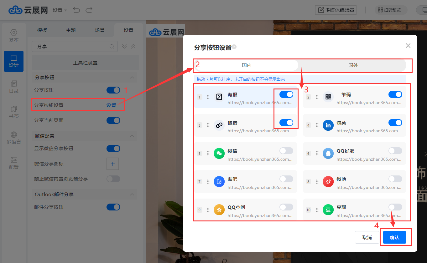 點(diǎn)擊【分享按鈕設(shè)置】,選擇國內(nèi)/國外分享按鈕,自定義勾選分享配置,拖動卡片可以排序,設(shè)置好后點(diǎn)擊【確認(rèn)】