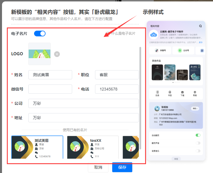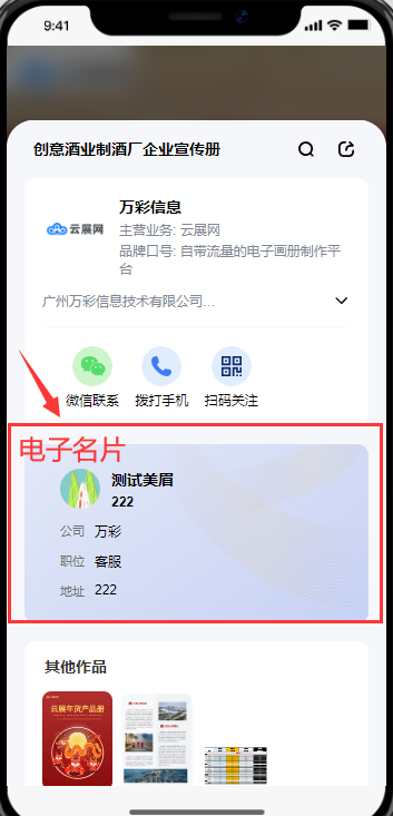 電子名片是指添加您的logo圖、姓名、職位、微信號,電話等信息形成電子名片,展示在相關(guān)內(nèi)容面板上,可以快速地與潛在客戶建立聯(lián)系,提高溝通效率和響應(yīng)速度。