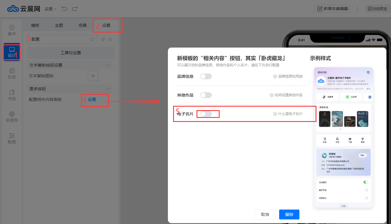 點擊【設(shè)計】,點擊【設(shè)置】,在搜索欄輸入”配置”關(guān)鍵字查找,點擊【配置相關(guān)內(nèi)容面板】設(shè)置,開啟電子名片功能