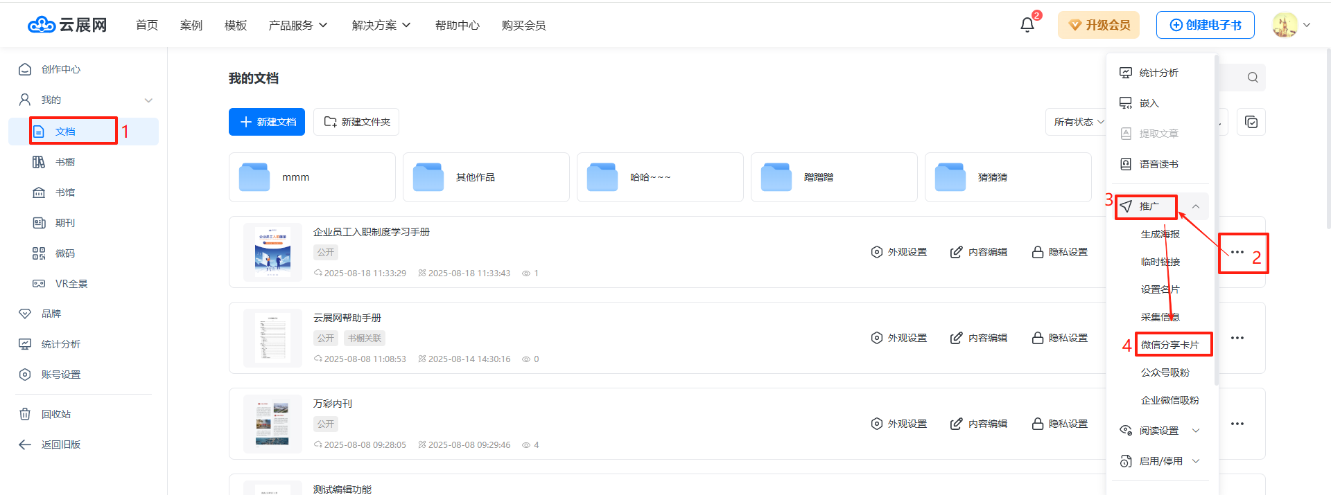 在【文檔】頁(yè)面右側(cè),點(diǎn)擊“…”三個(gè)點(diǎn)按鈕,點(diǎn)擊【推廣】,隨后點(diǎn)擊【微信分享卡片】