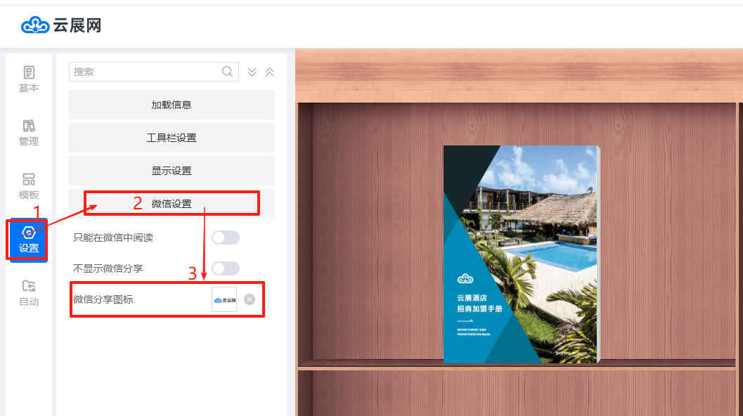 在【設(shè)置】頁(yè)面,點(diǎn)擊【微信設(shè)置】,上傳微信分享圖標(biāo)
