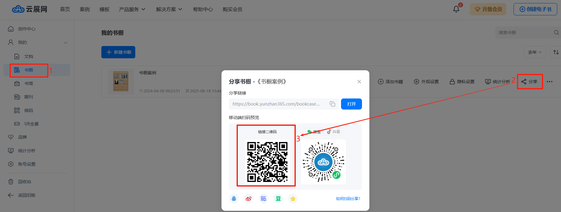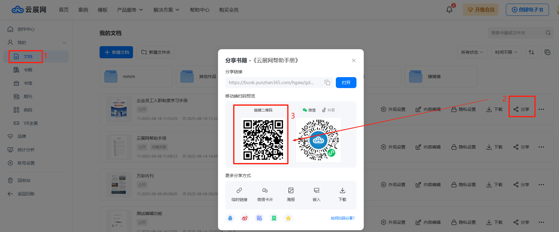 在【文檔】/【書櫥】頁(yè)面,點(diǎn)擊【分享】,獲取書籍鏈接二維碼/書櫥二維碼