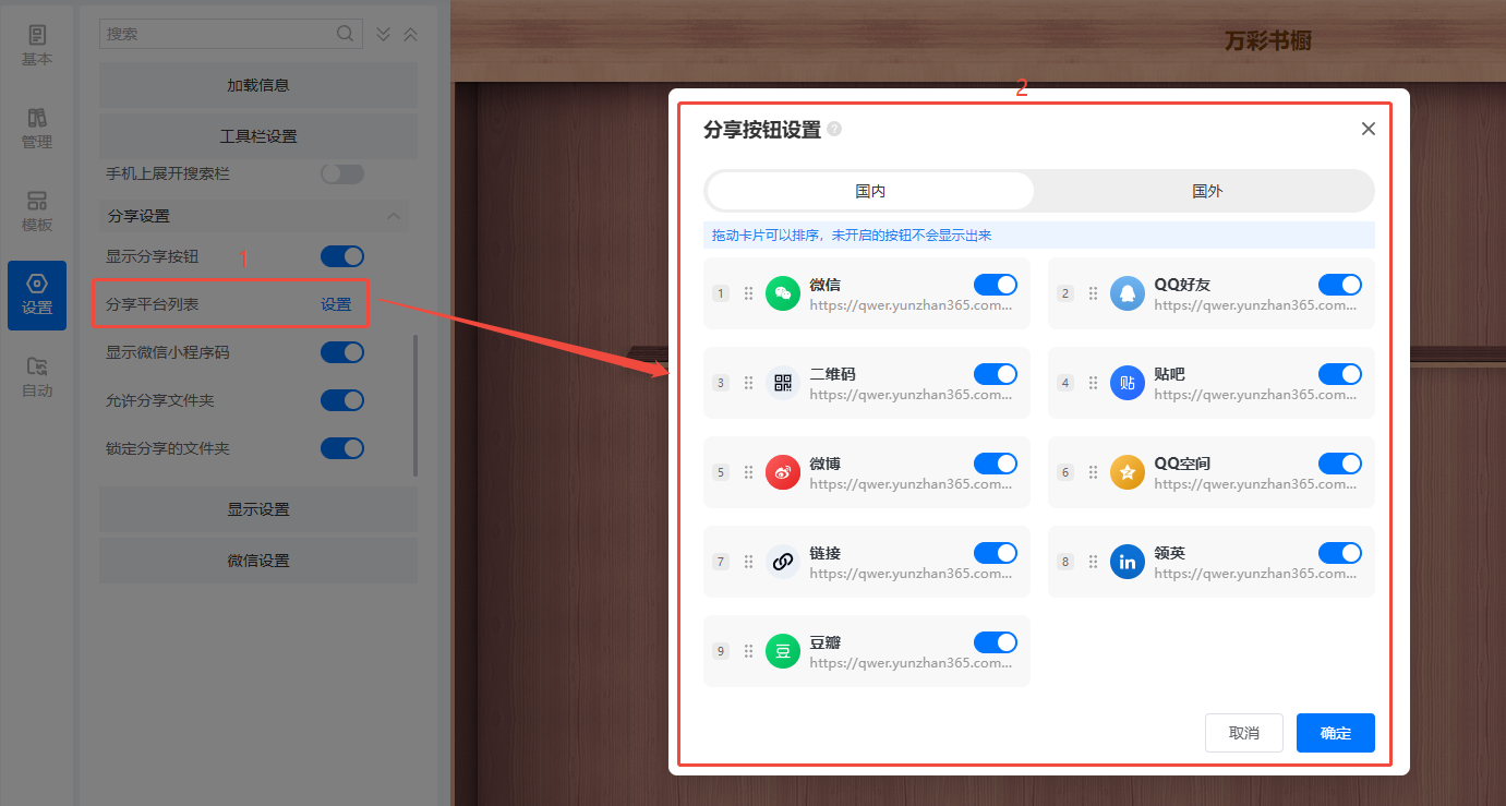 - 分享平臺列表:編輯排列分享按鈕中的國內(nèi)或者國外的平臺列表