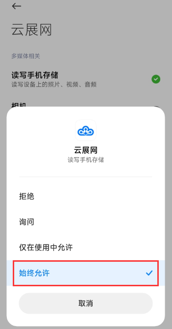可能是app向您申請存儲訪問權(quán)限時,您拒絕過,重新打開權(quán)限即可,請看如下操作: