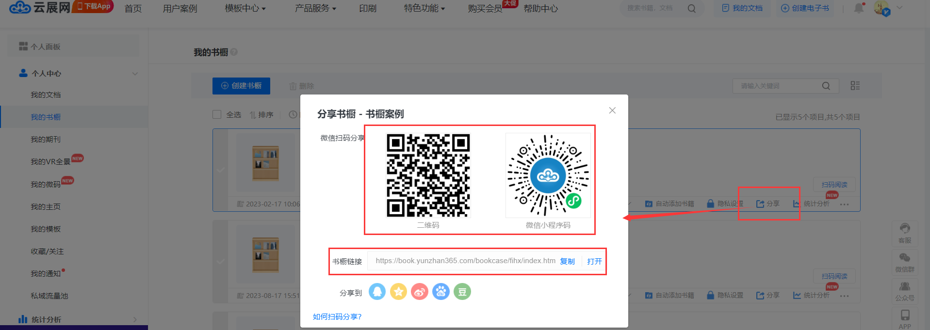 每個書櫥都有相應(yīng)的鏈接、二維碼以及小程序碼,在【我的書櫥】頁面,創(chuàng)建書櫥后自動生成,如下圖操作,可以查看到書櫥鏈接、二維碼和小程序碼
