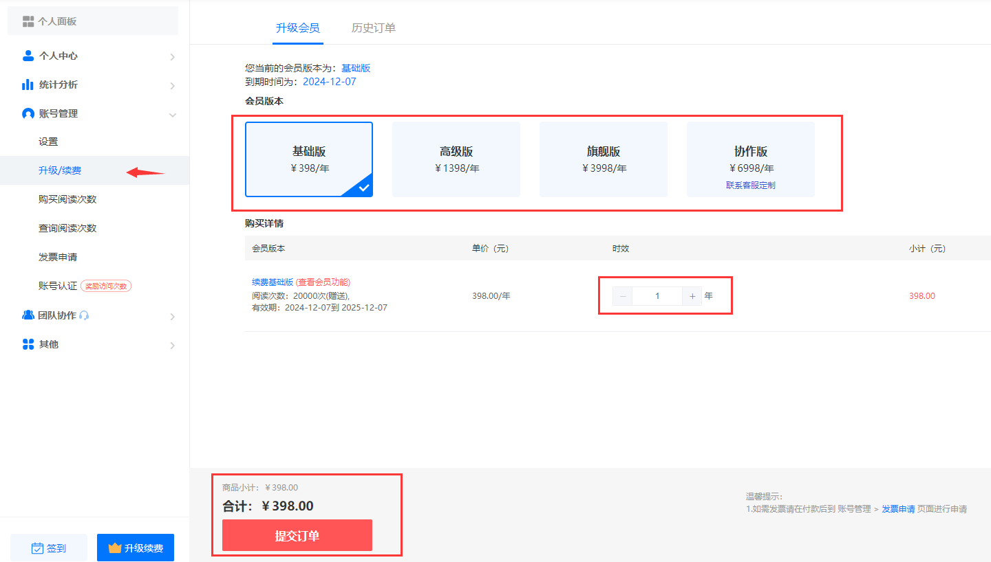 登錄需要續(xù)費(fèi)的賬號(hào),然后選擇購買的版本,提交訂單以后選擇支付方式付款。如圖: