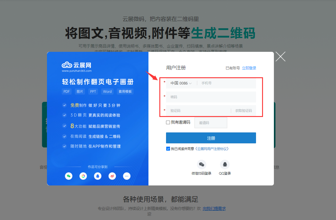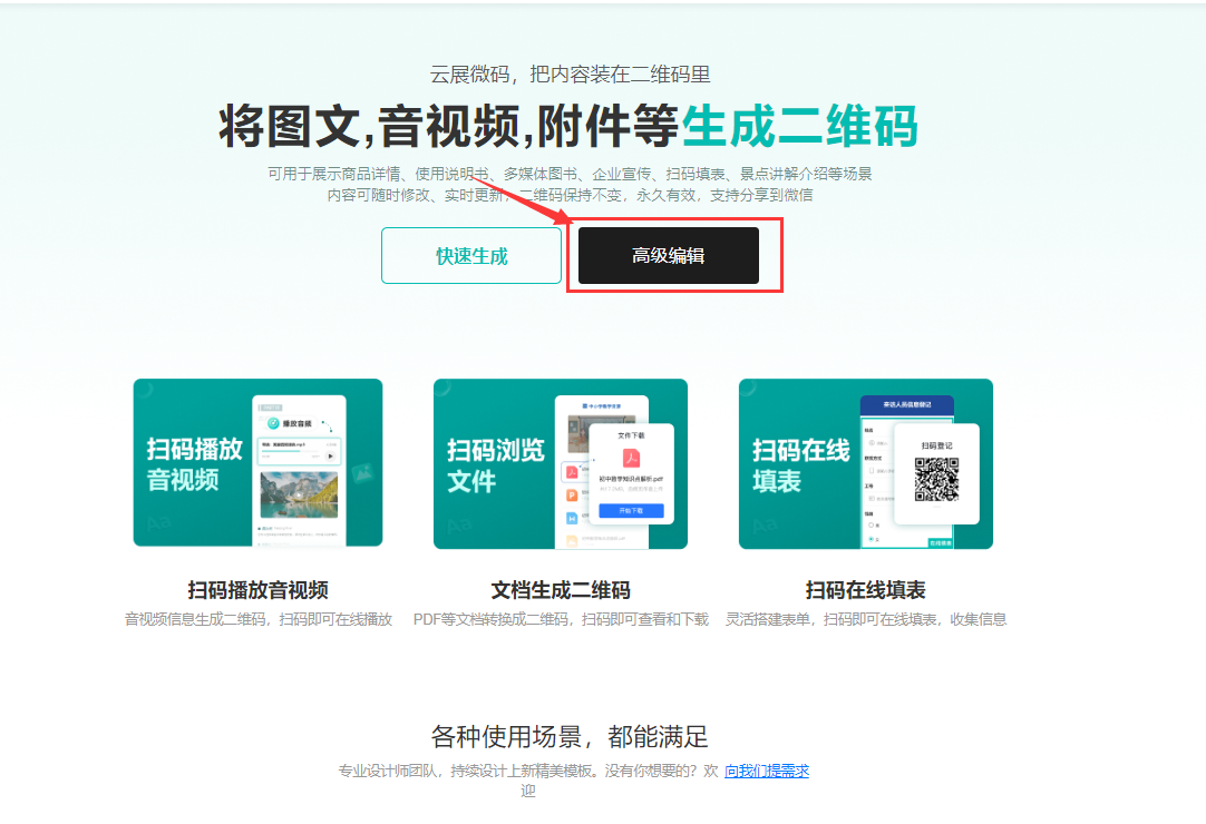 打開云展微碼鏈接,點(diǎn)擊【高級(jí)編輯】,輸入手機(jī)號(hào)和密碼注冊(cè)后并登錄。