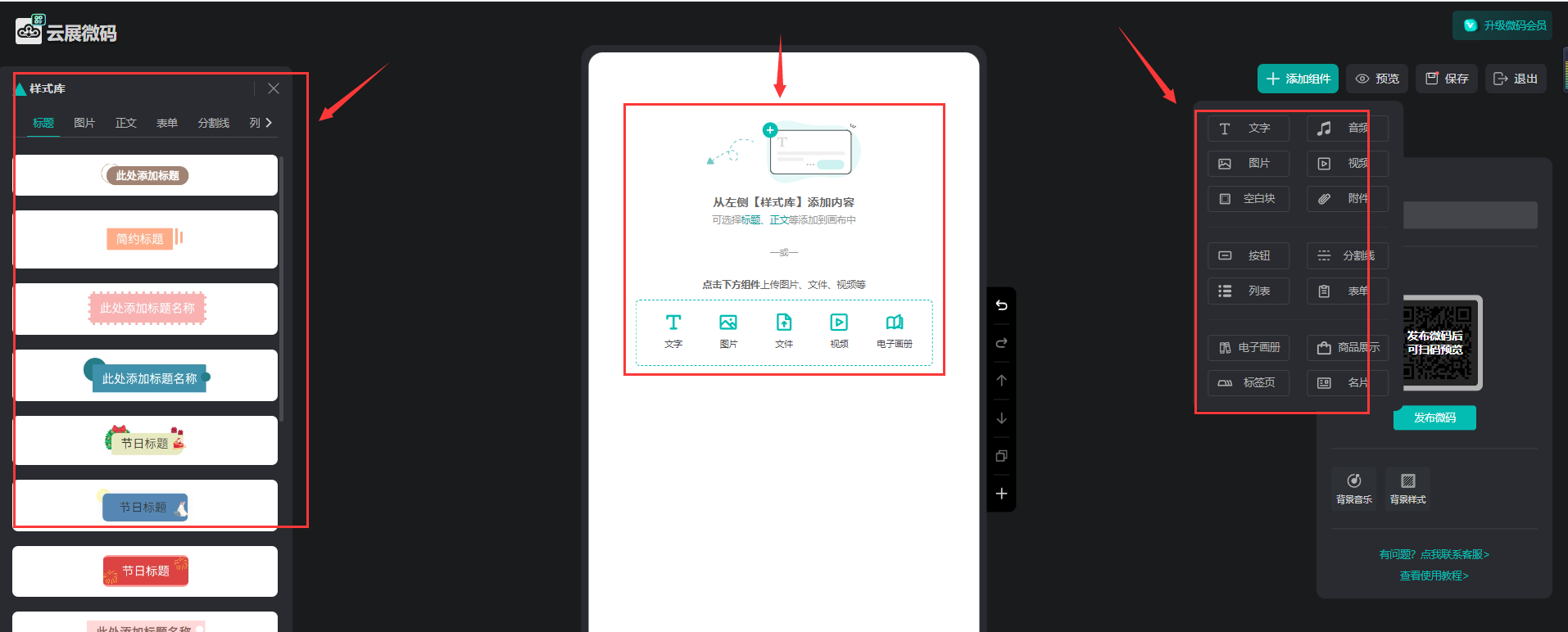 4、進(jìn)入編輯器頁面,在頁面上添加圖文、音視頻、附件,設(shè)置樣式等內(nèi)容