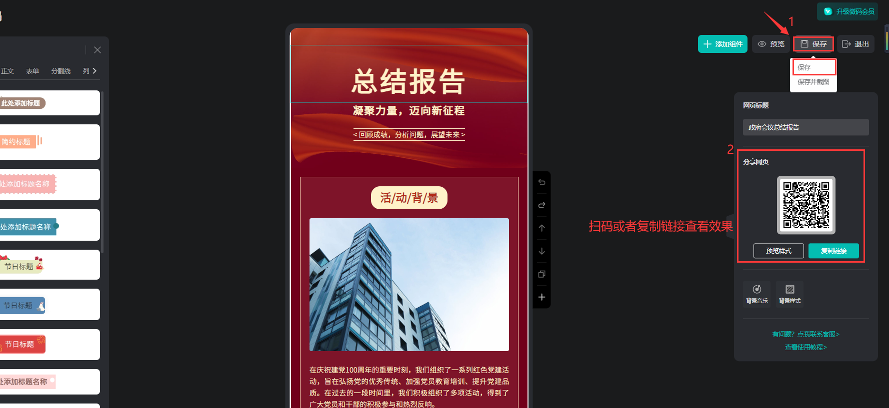 5、編輯排版好后點(diǎn)擊右上角的【保存】,保存后可以生成微碼鏈接和二維碼分享