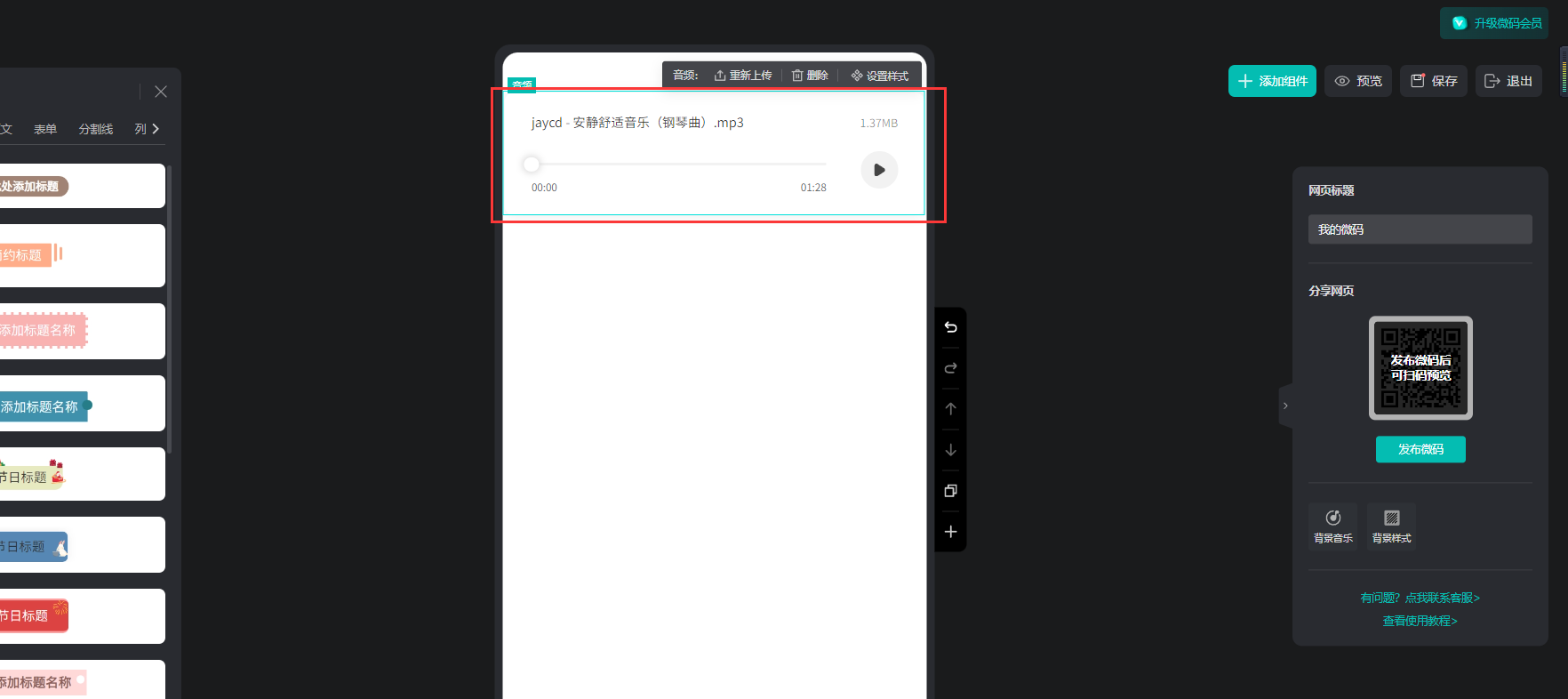點(diǎn)擊【添加組件】,點(diǎn)擊【音頻】,上傳mp3格式的音頻文件添加到頁(yè)面上